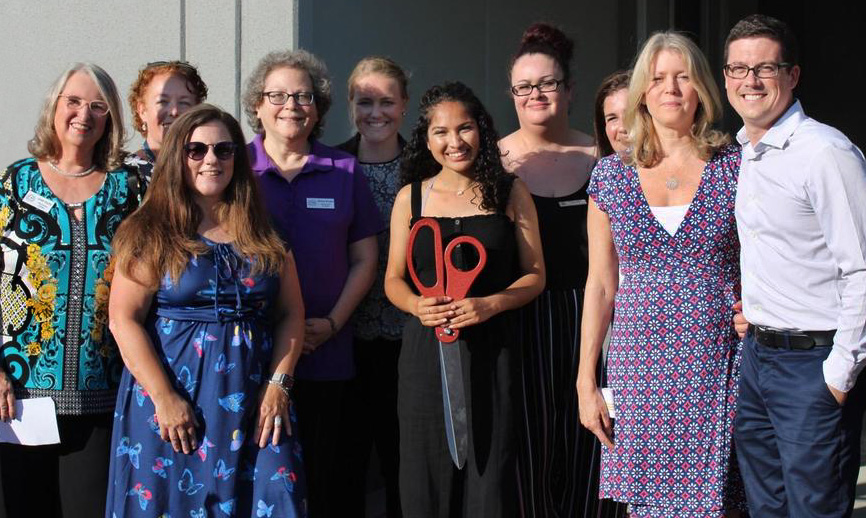 Official ribbon cutting with a wonderful address by student Board member Geetanjali Jain (holding scissors.